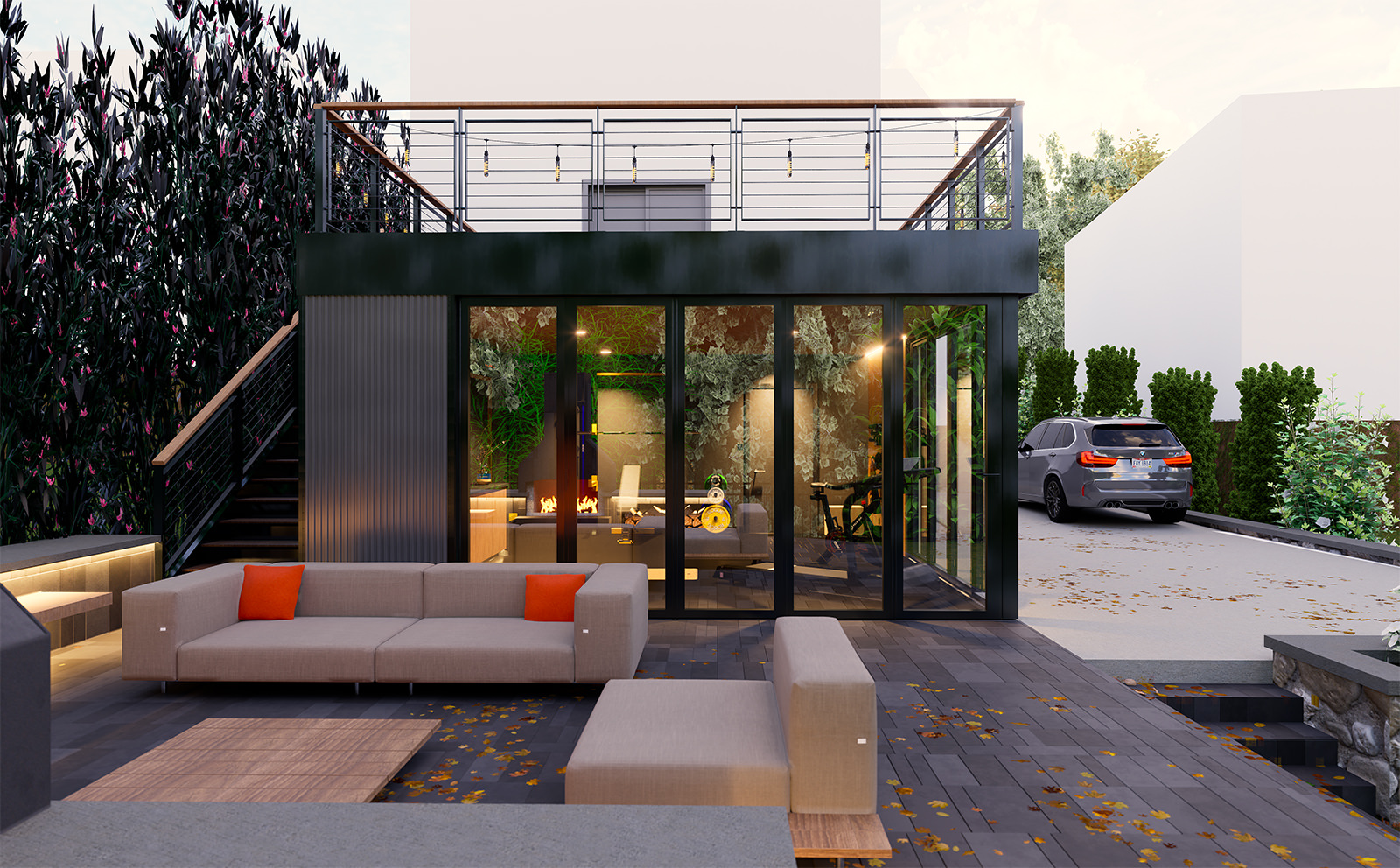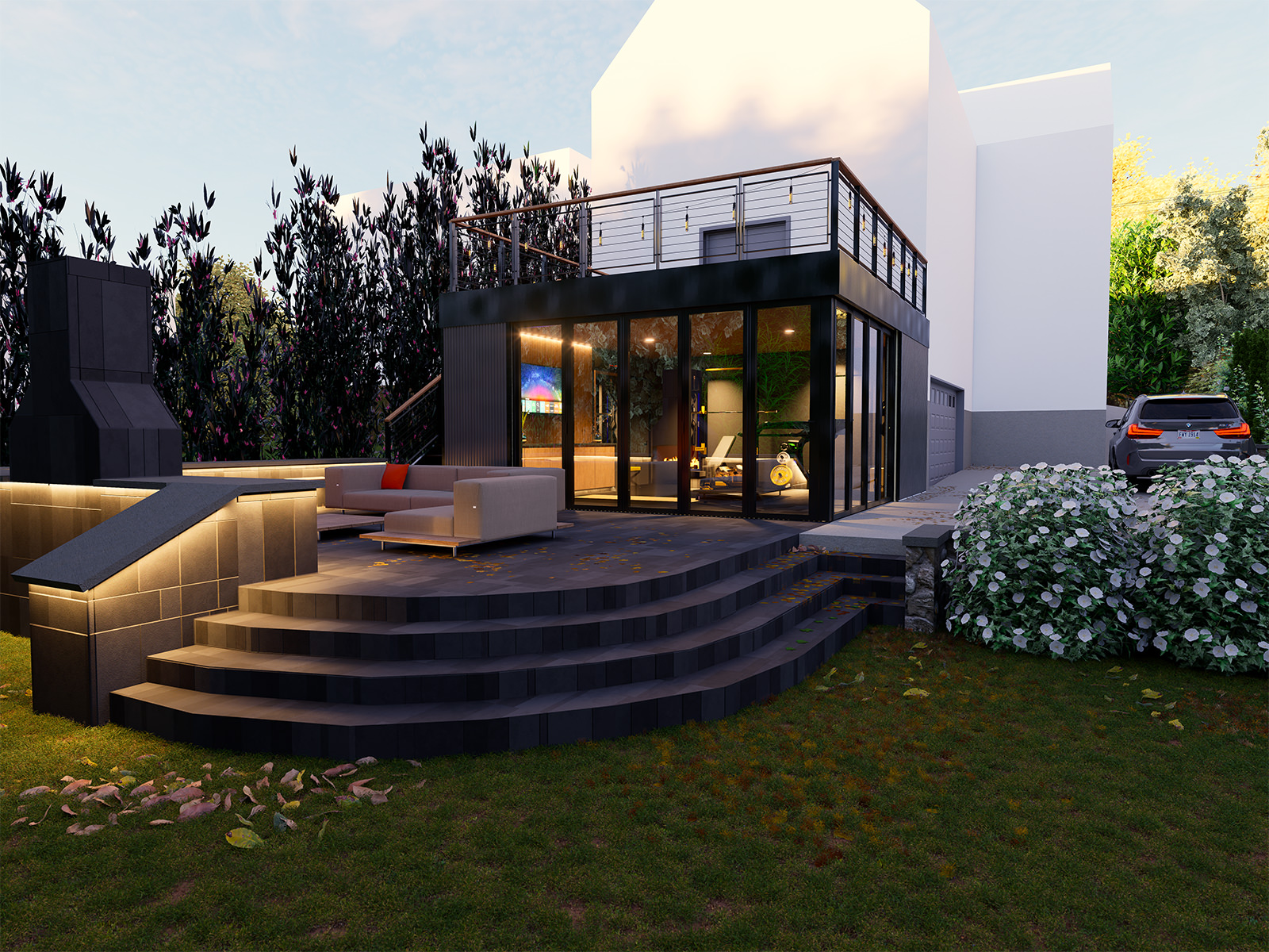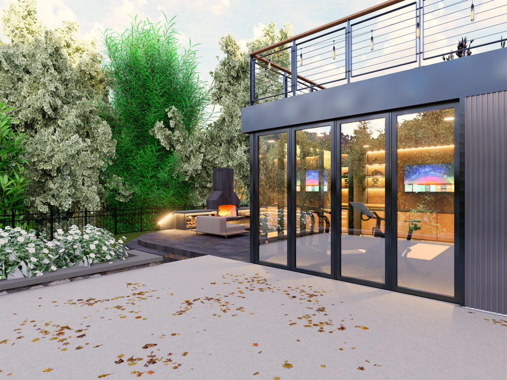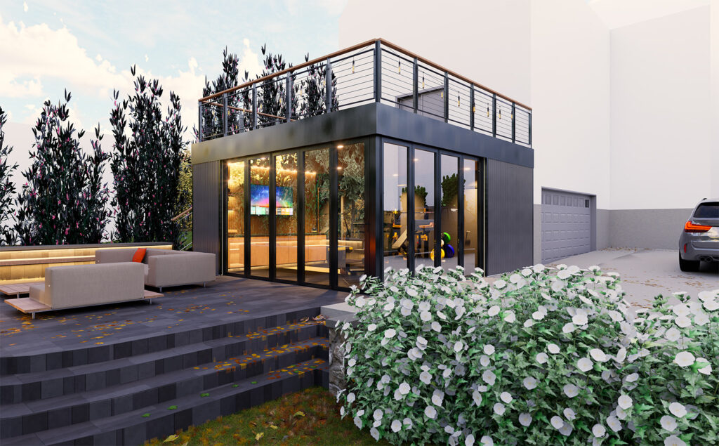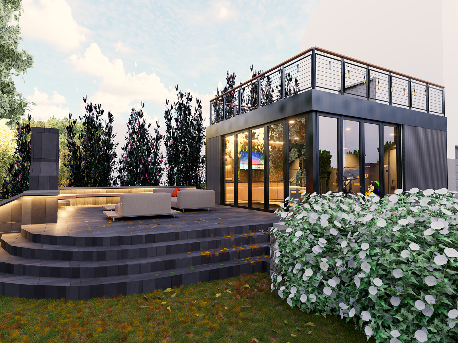 Perched along the hilltops of Mt. Lookout, this workout room reads as a compact pavilion—equal parts training studio and outdoor living room—set into a terraced landscape. A series of broad, curved steps and a low seat wall choreograph the approach, creating an amphitheater-like forecourt that doubles as a warm-up zone, social perch, and viewing platform to the trees beyond.