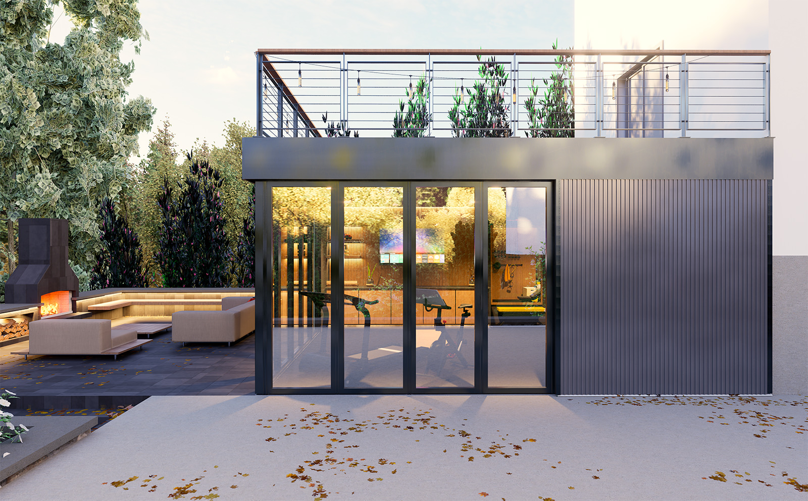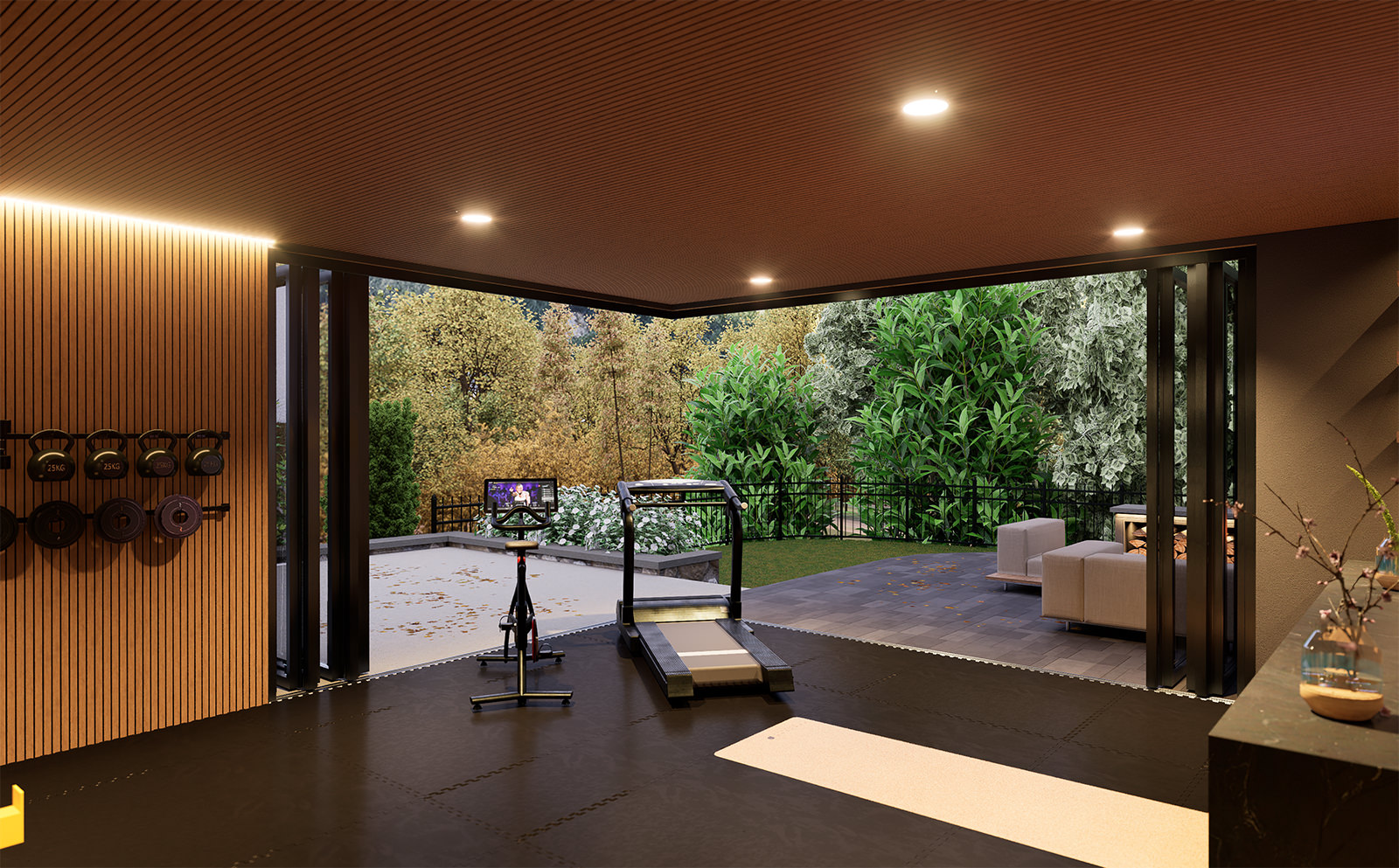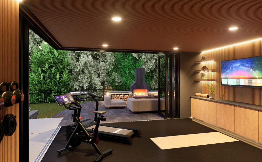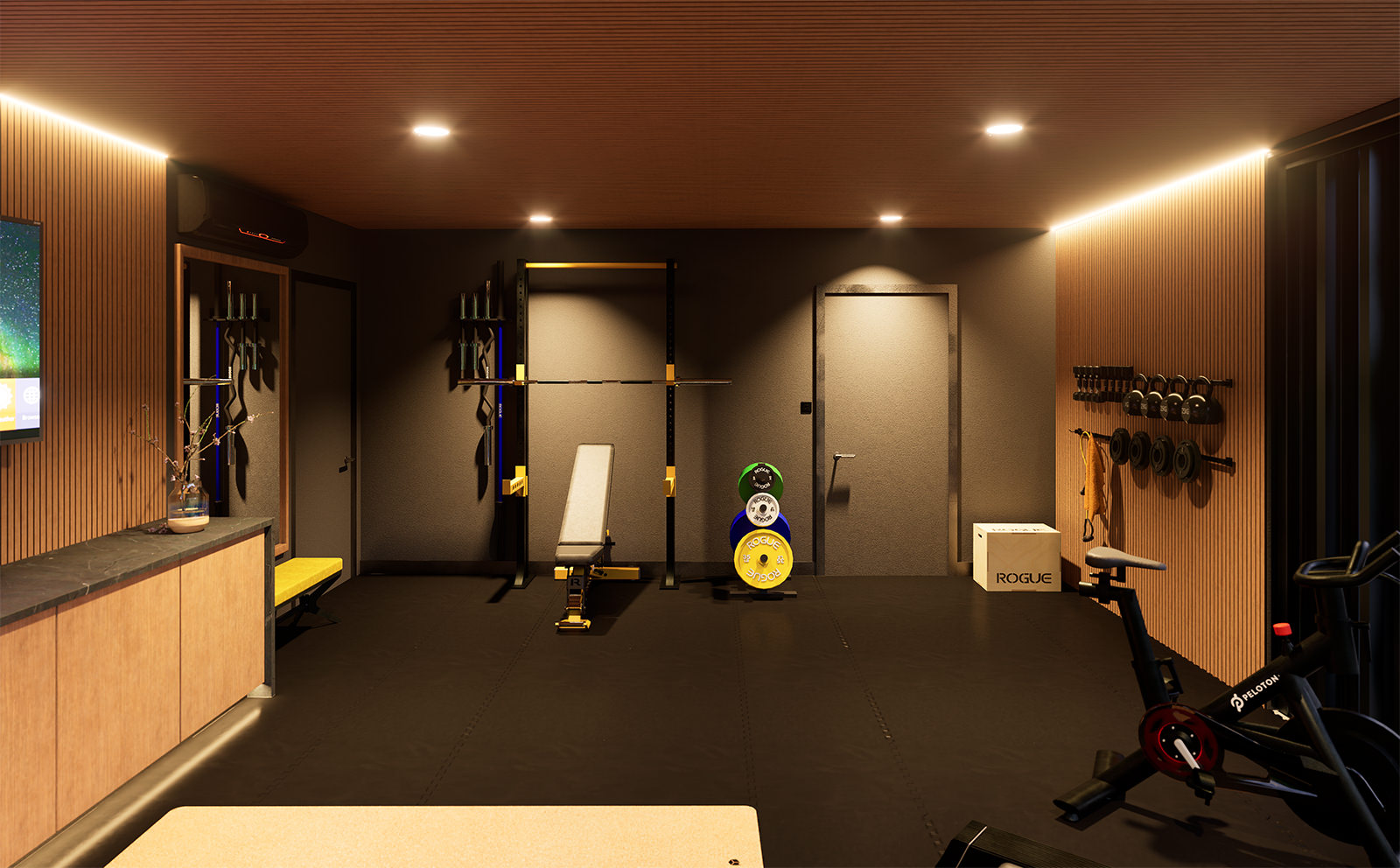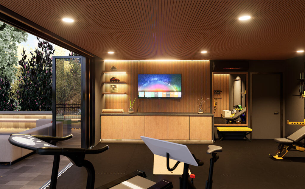 The building itself is defined by contrast and precision: a dark, monolithic exterior frame anchors the volume against the bright sky, while a warm, wood-lined soffit and interior millwork pull light inward. This dark/light pairing is doing more than “style”—it’s a spatial device that sharpens depth and outlines the body in motion. Under the recessed ceiling, the controlled illumination reads like a stage wash: it reduces visual noise, isolates the training zone, and makes the human figure the most legible object in the room. Currently under construction.