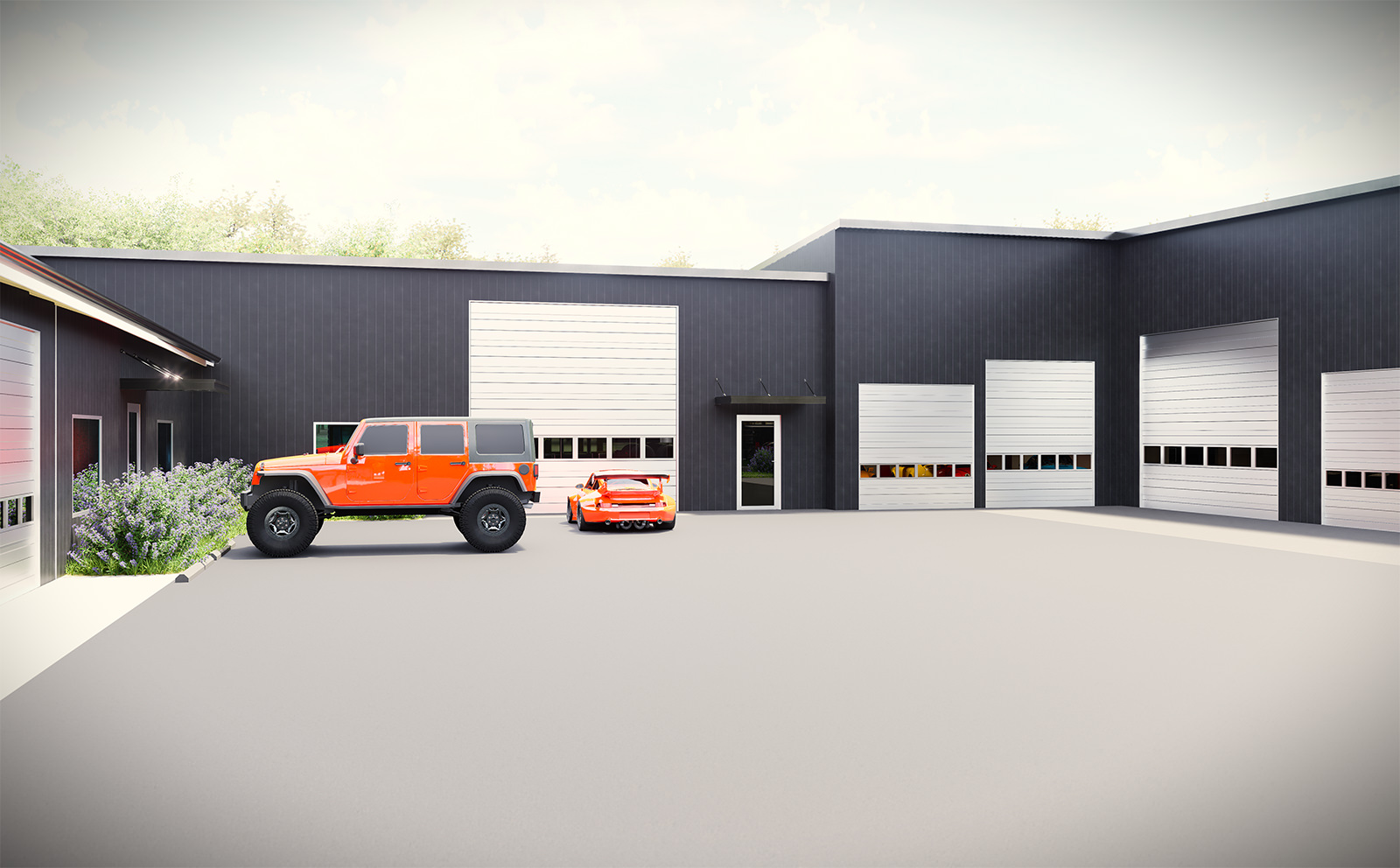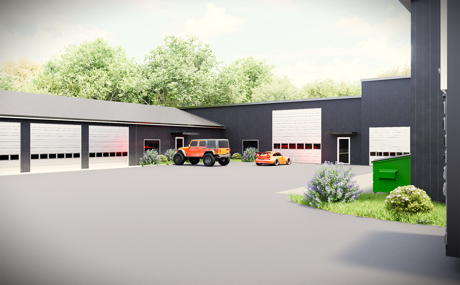 The addition is organized around circulation as the primary architectural driver. Oversized bay doors, staging zones, and service edges establish a continuous workflow from arrival to prep to deployment, while separating heavy vehicle movement from staff and visitor access. The massing reinforces this logic: a simple, durable envelope that reads as a single working volume, paired with a lower, more human-scaled frontage that marks entry and supports day-to-day administrative needs.